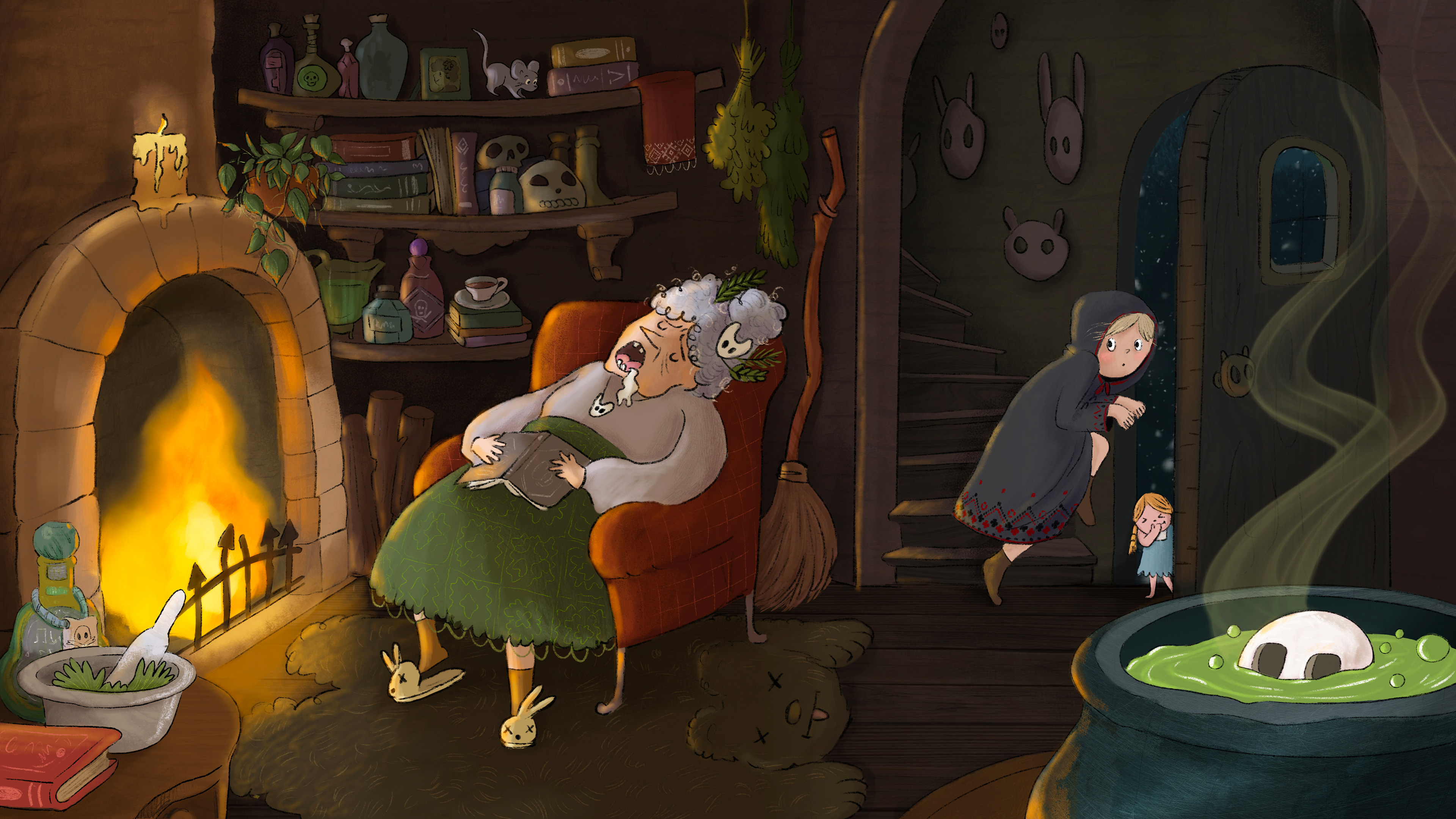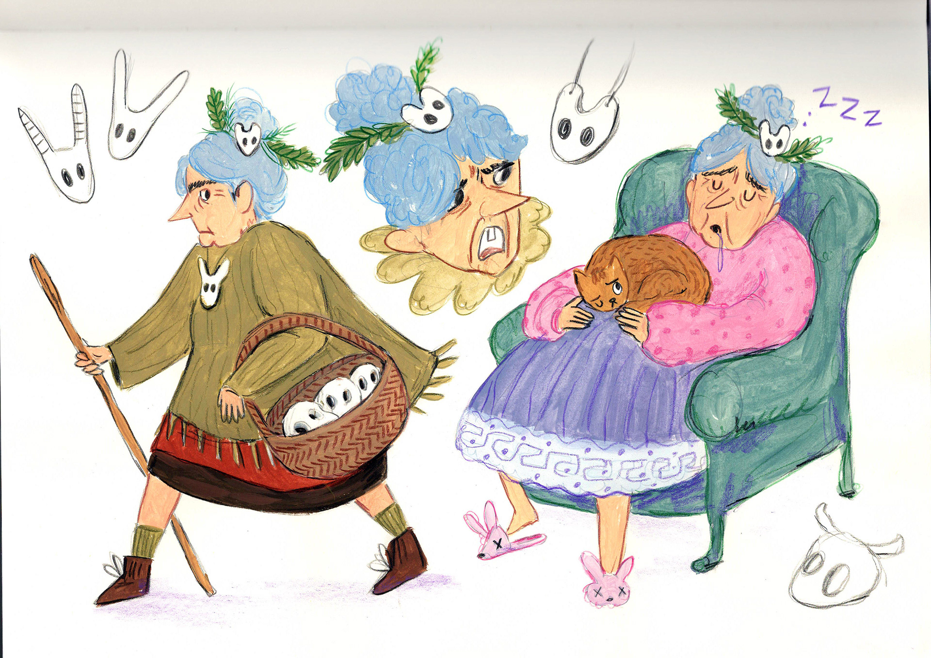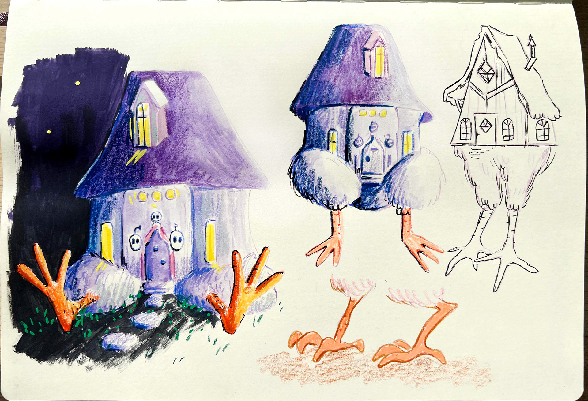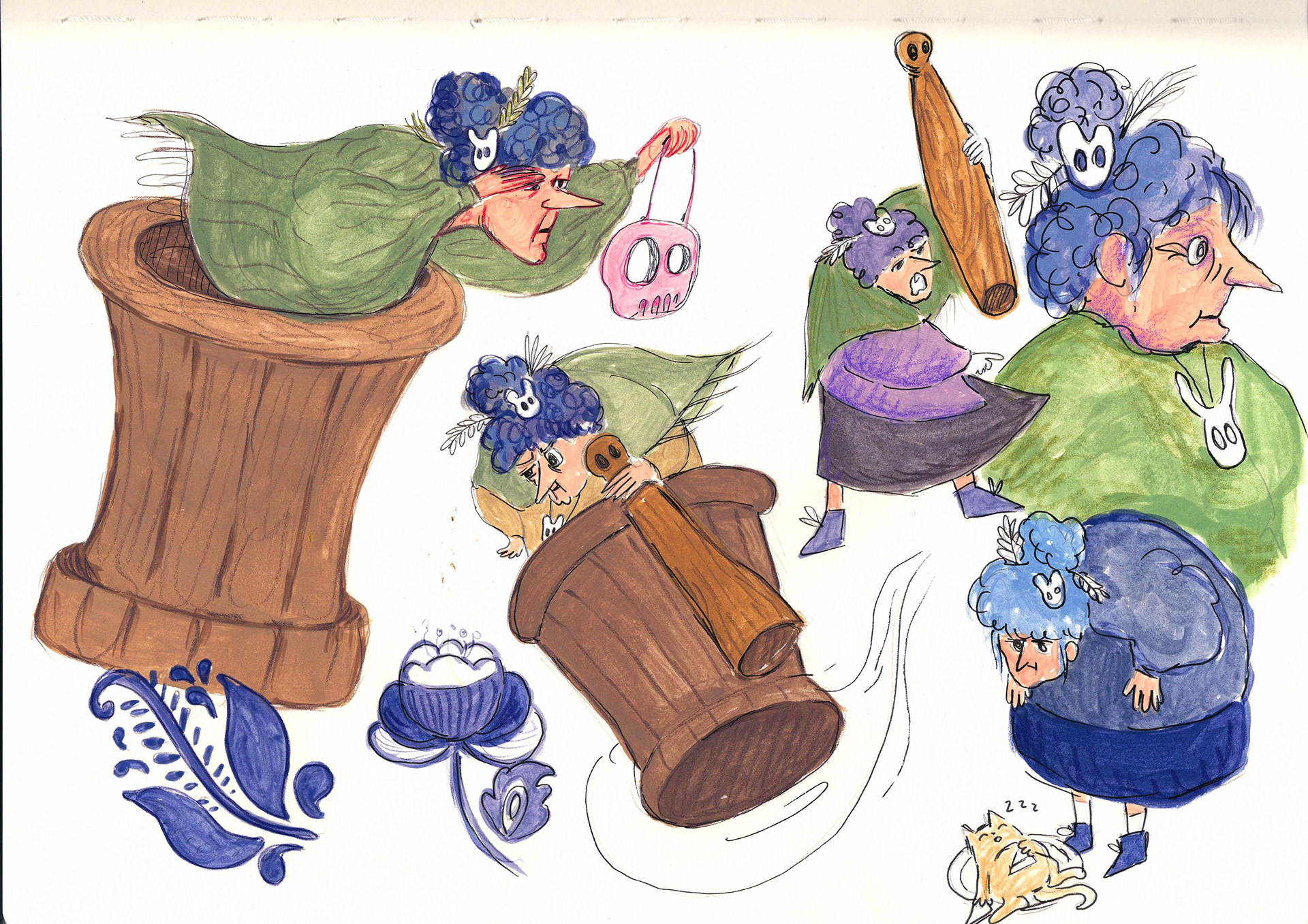 Illustration studies based on the vintage tale of Baba Yaga, featuring spot illustrations, full spreads, and character exploration sketches that reimagine the classic folklore with a fresh visual approach.