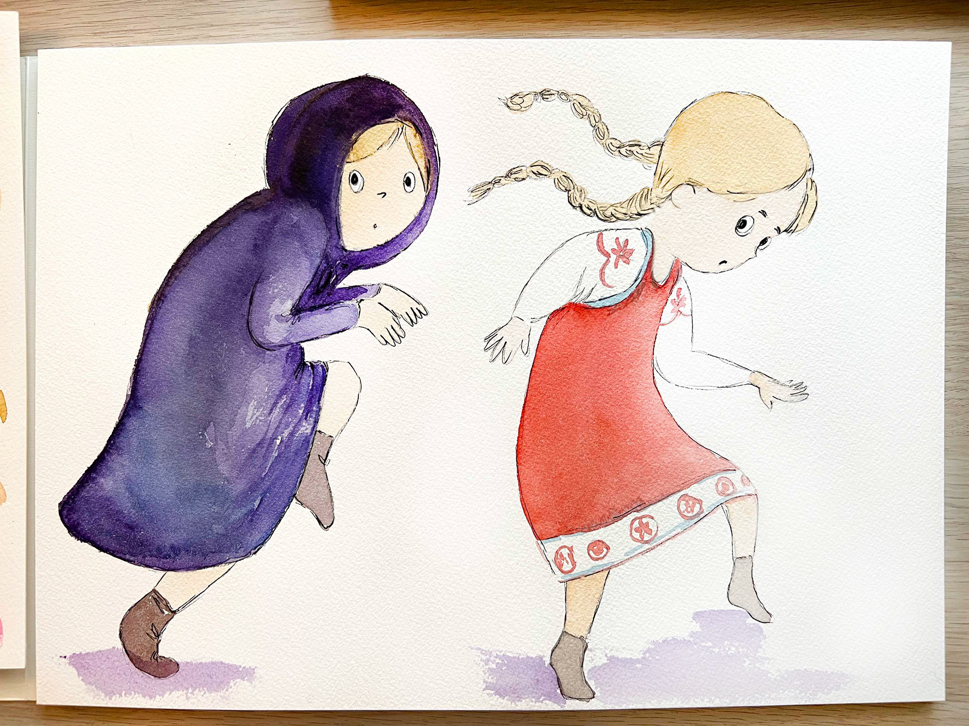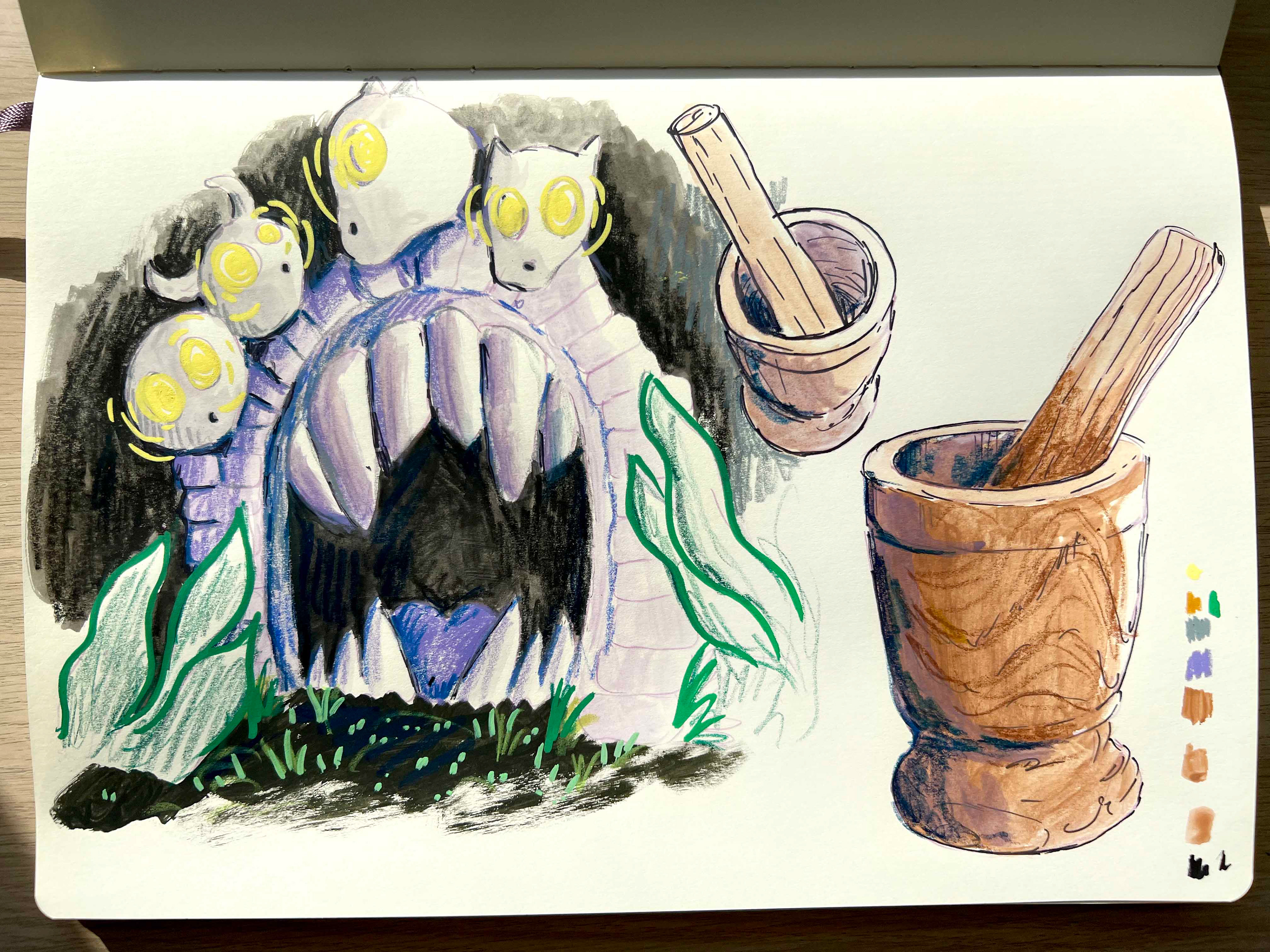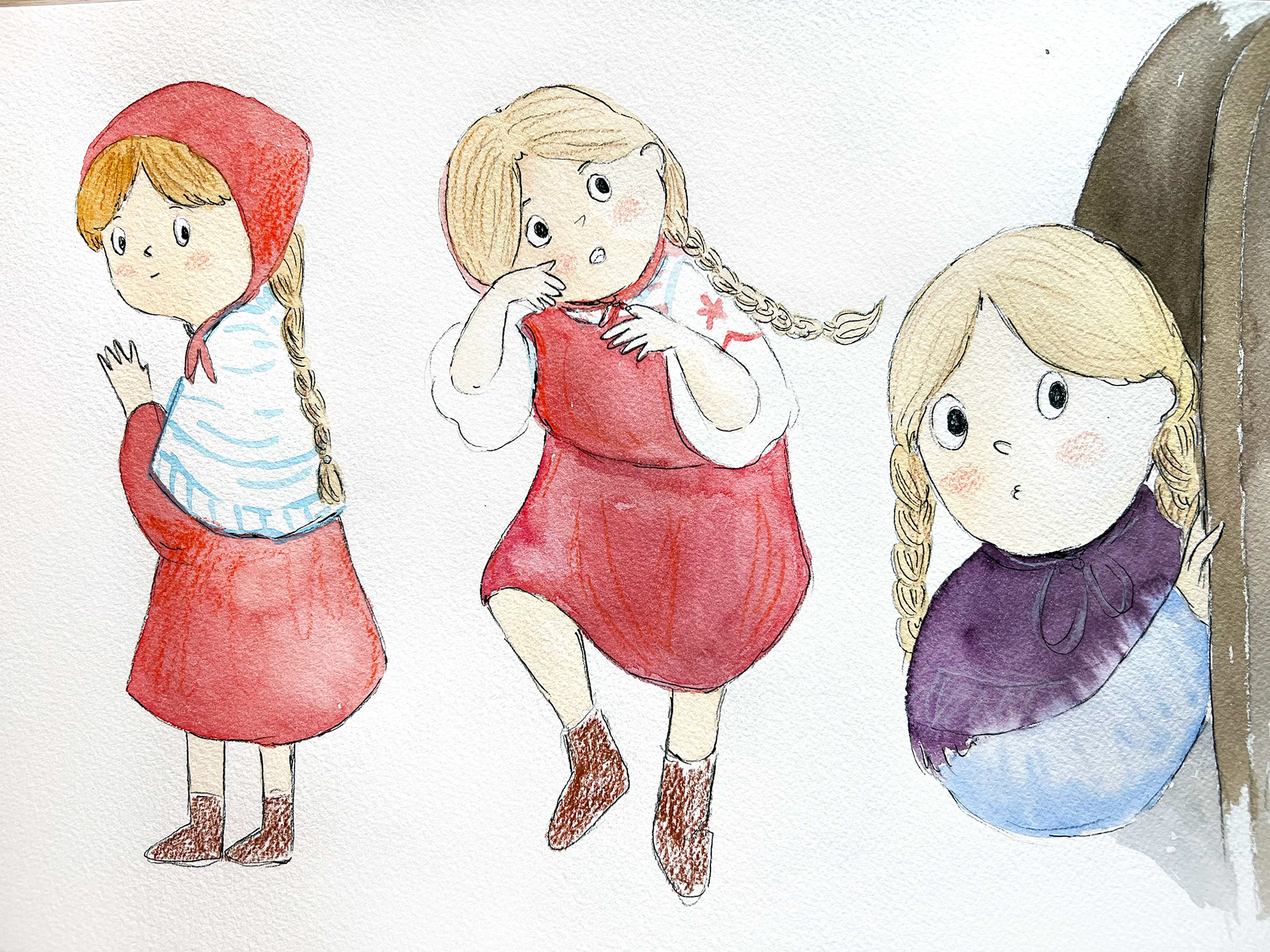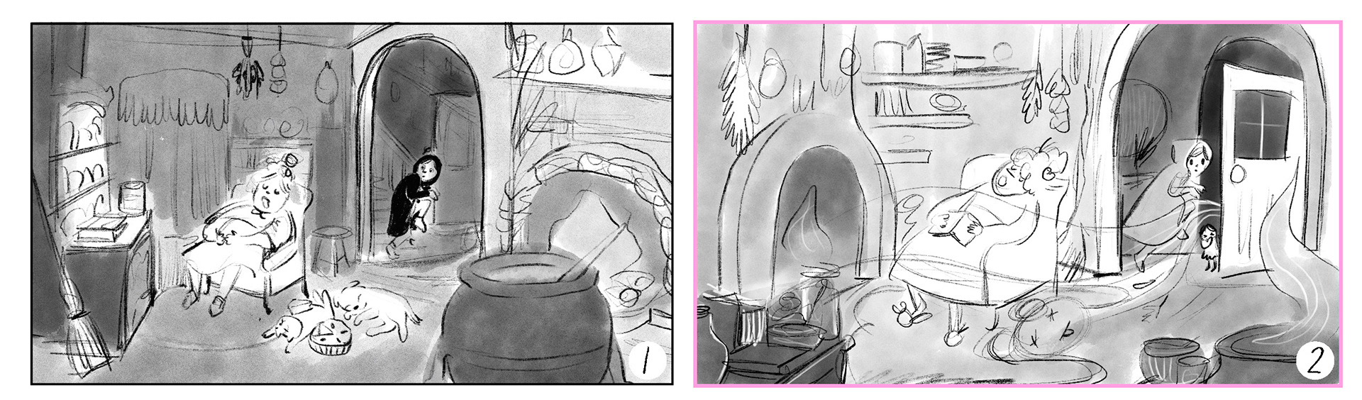Illustration studies based on the vintage tale of Baba Yaga, featuring spot illustrations, full spreads, and character exploration sketches that reimagine the classic folklore with a fresh visual approach.