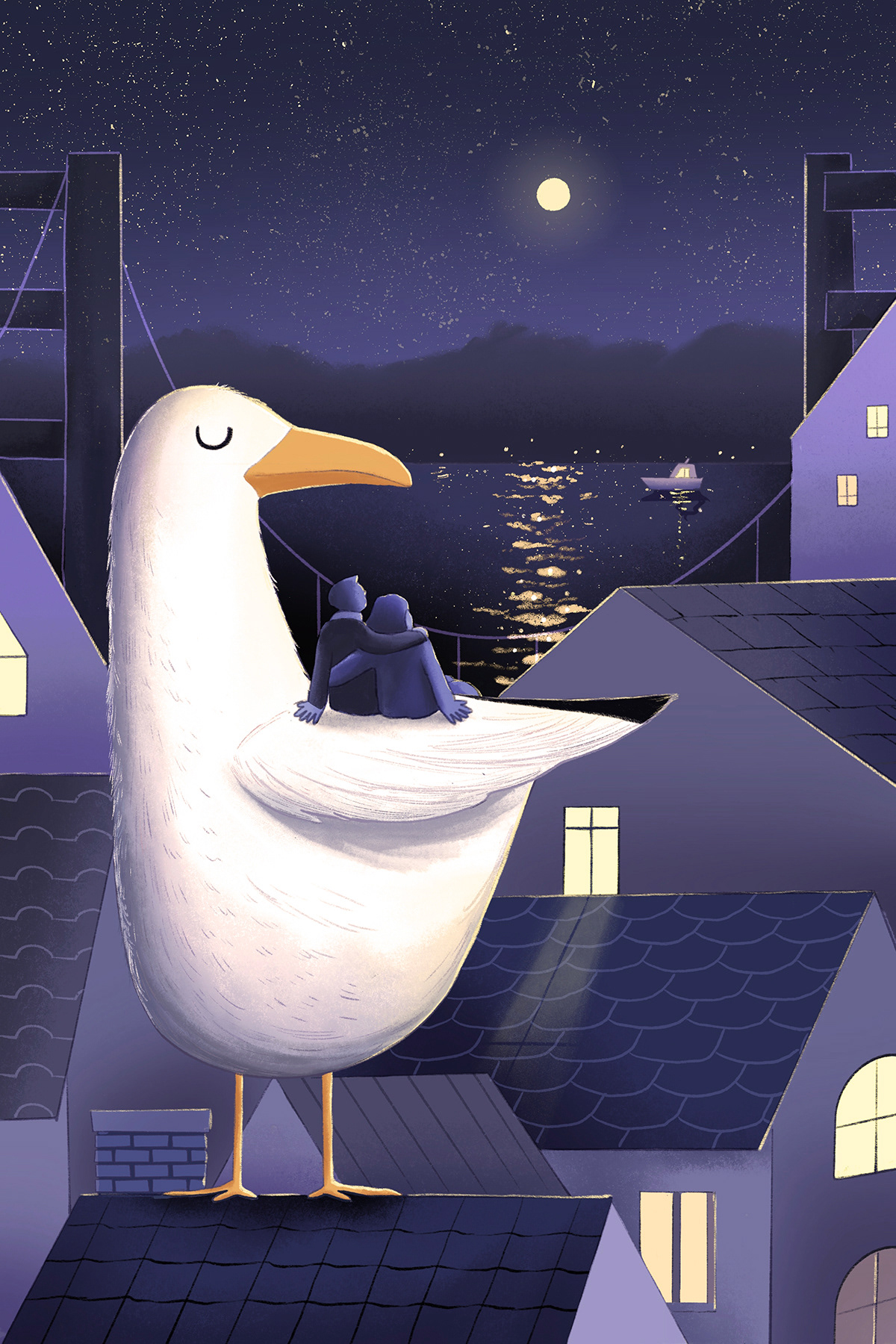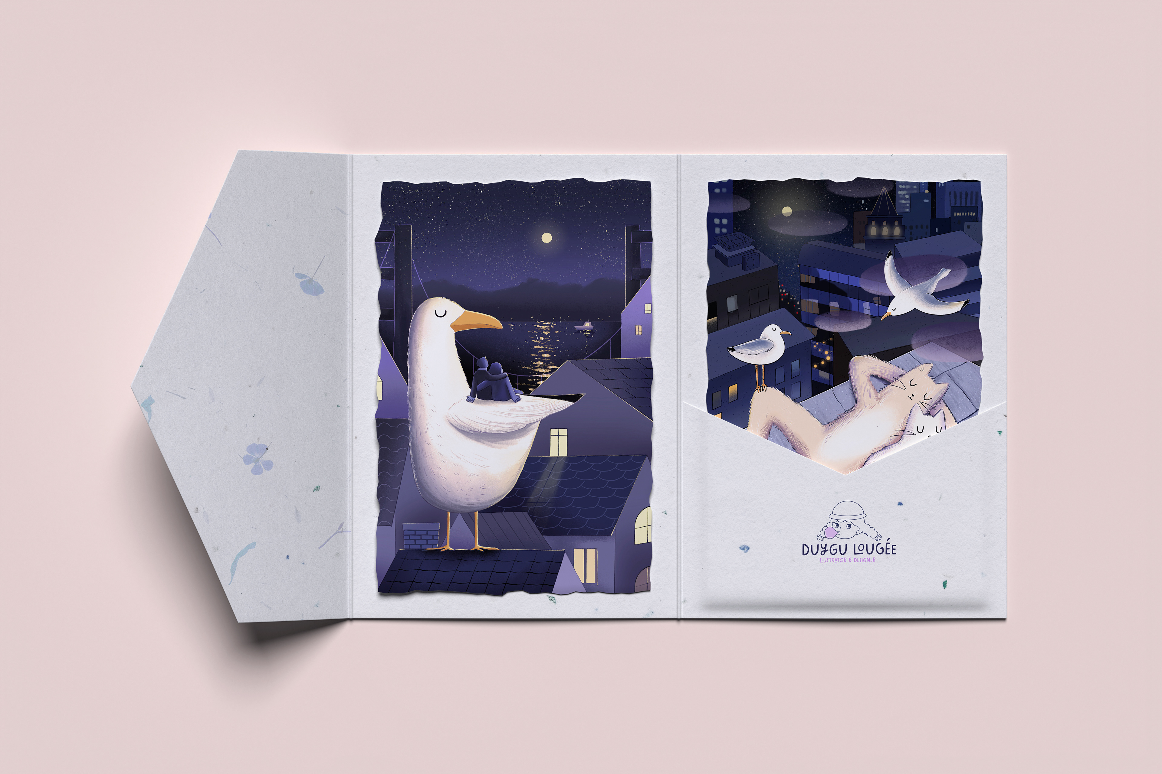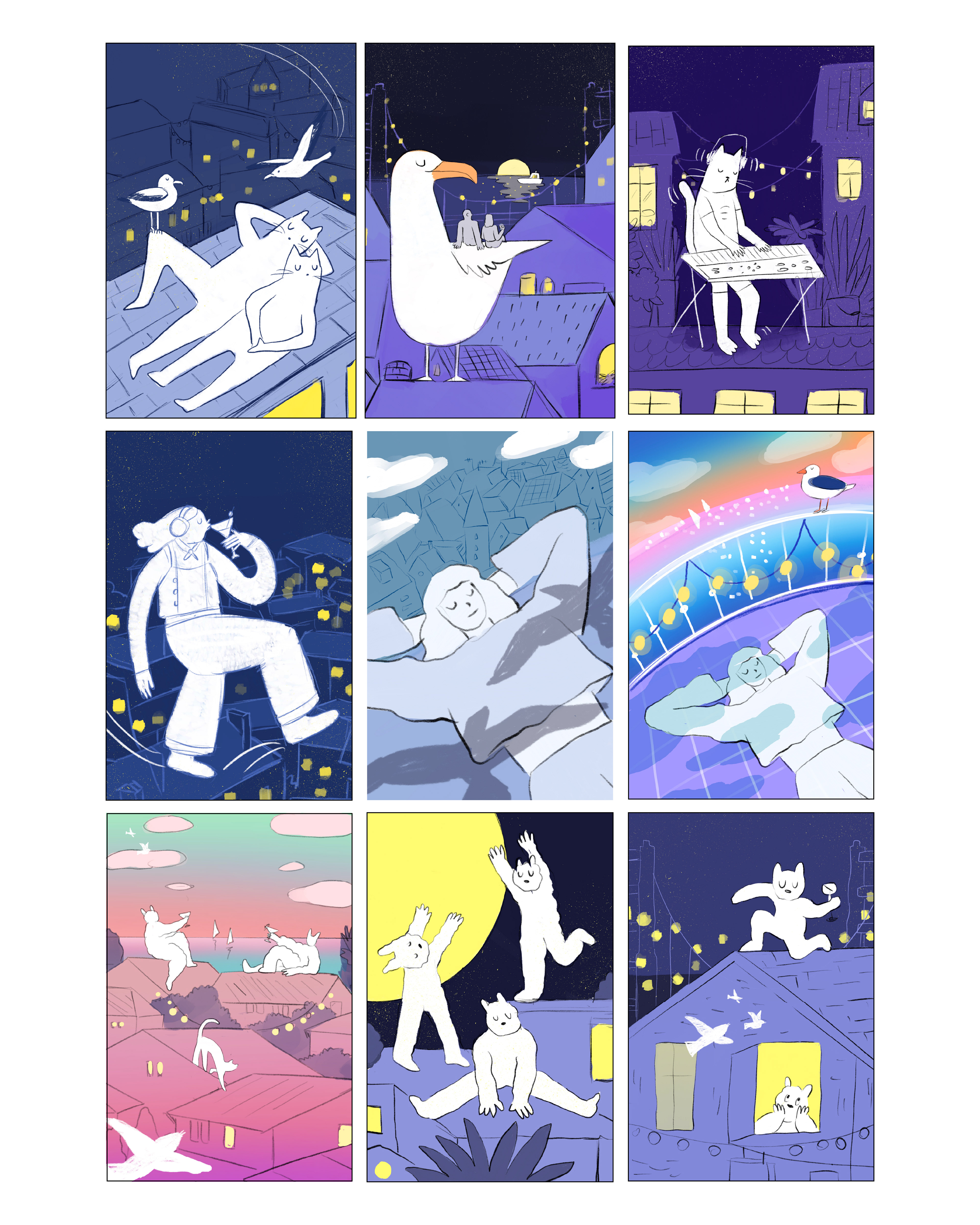 A series of illustrated postcards capturing quiet moments above the rooftops of Istanbul.