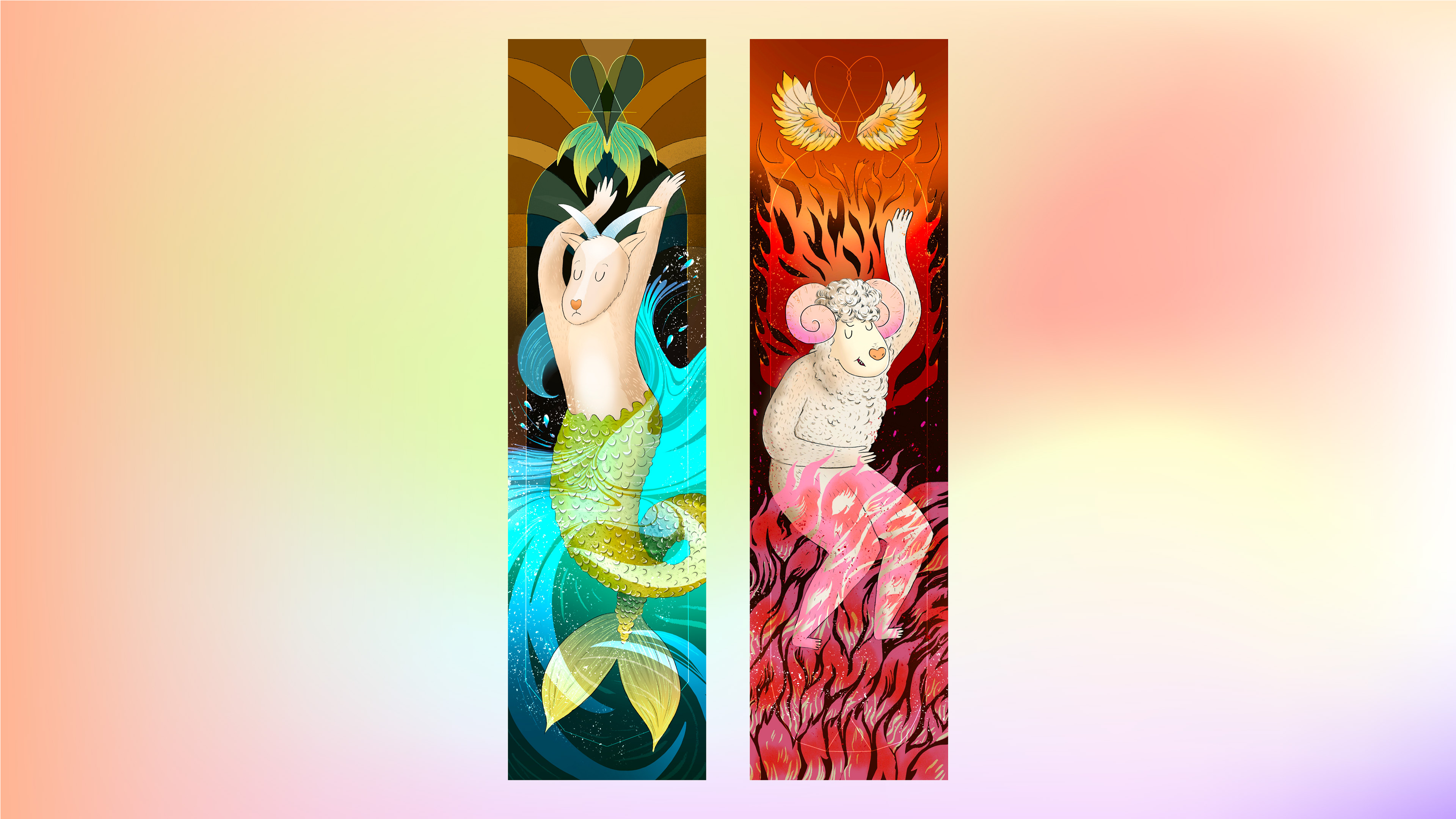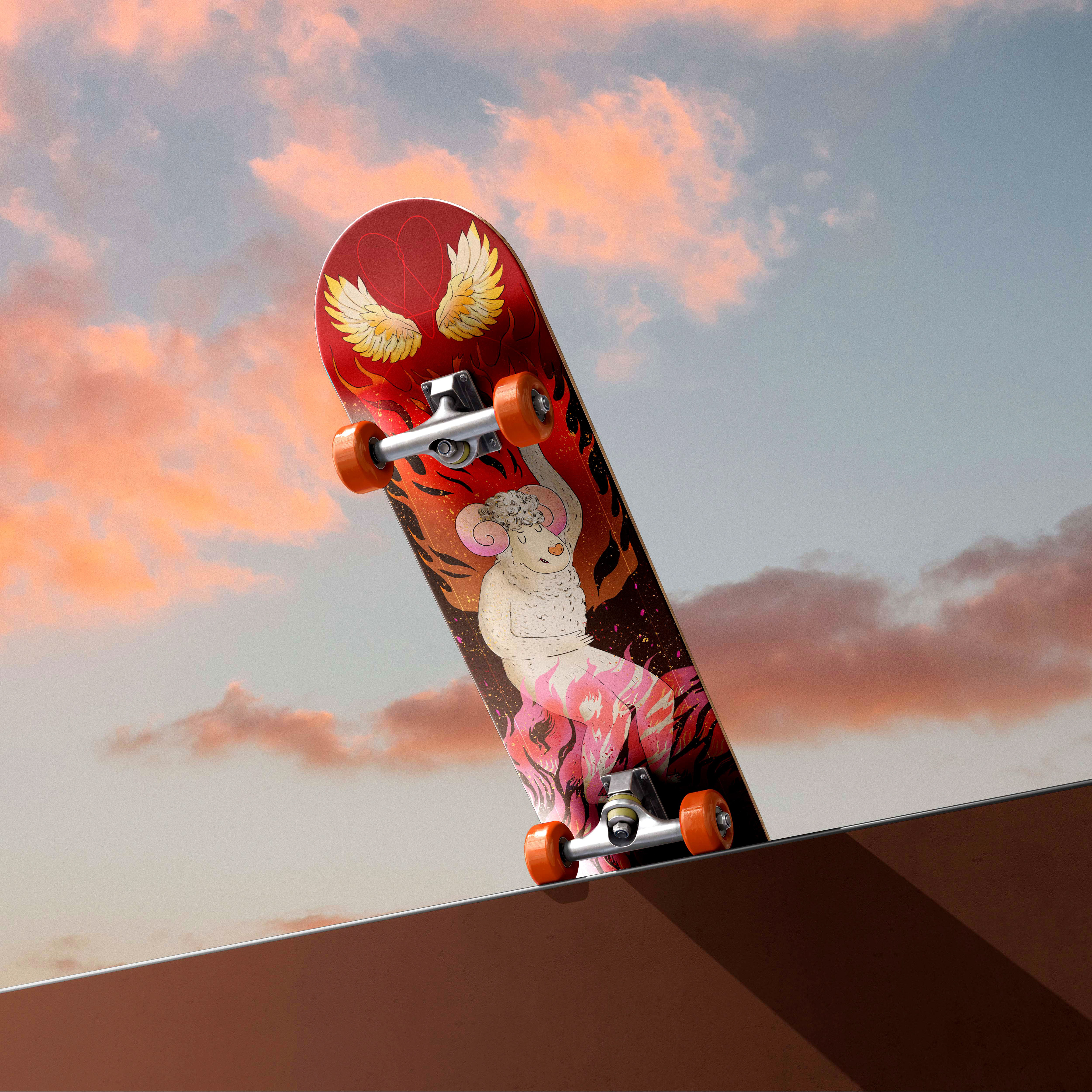 Skateboard designs featuring unique interpretations of each zodiac sign.